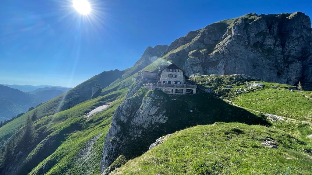 Die Bad Kissinger Hütte ist bekannt für ihre traumhafte Lage, ideal, um den Sonnenuntergang in den Alpen bewusst zu erleben. Der zünftige Hüttenabend mit regionalen Schmankerln wird sicher unvergesslich – und dank Hüttenruhe ab 22 Uhr starten wir ausgeruht in den nächsten Wandertag.