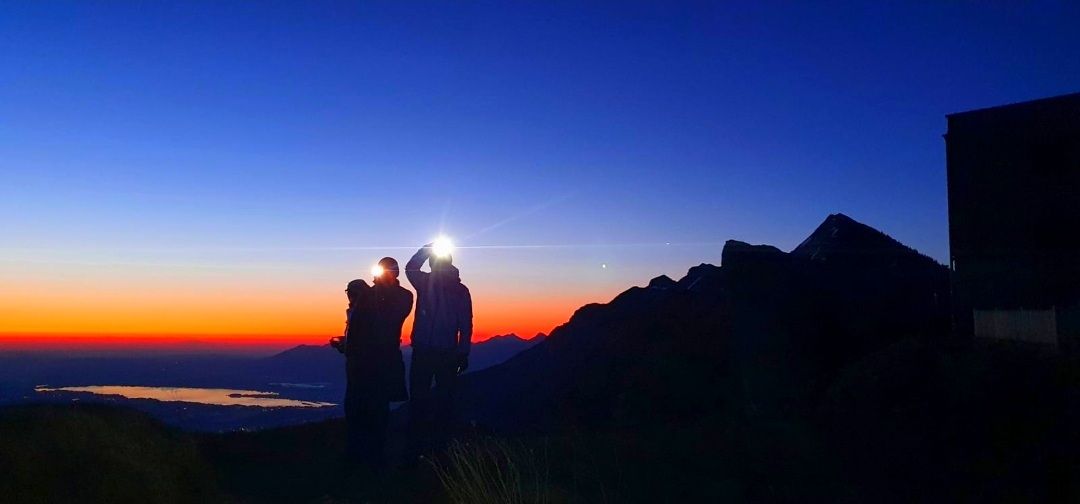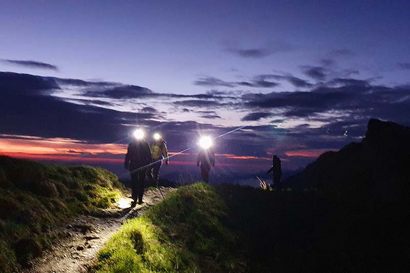Warm eingepackt und mit Stirnlampe starten wir in aller Frühe den Aufstieg zum Aggenstein-Gipfel. Über einige leichte Kraxelstellen erreichen wir schließlich den Gipfel – pünktlich zum magischen Sonnenaufgang in den Allgäuer Alpen.